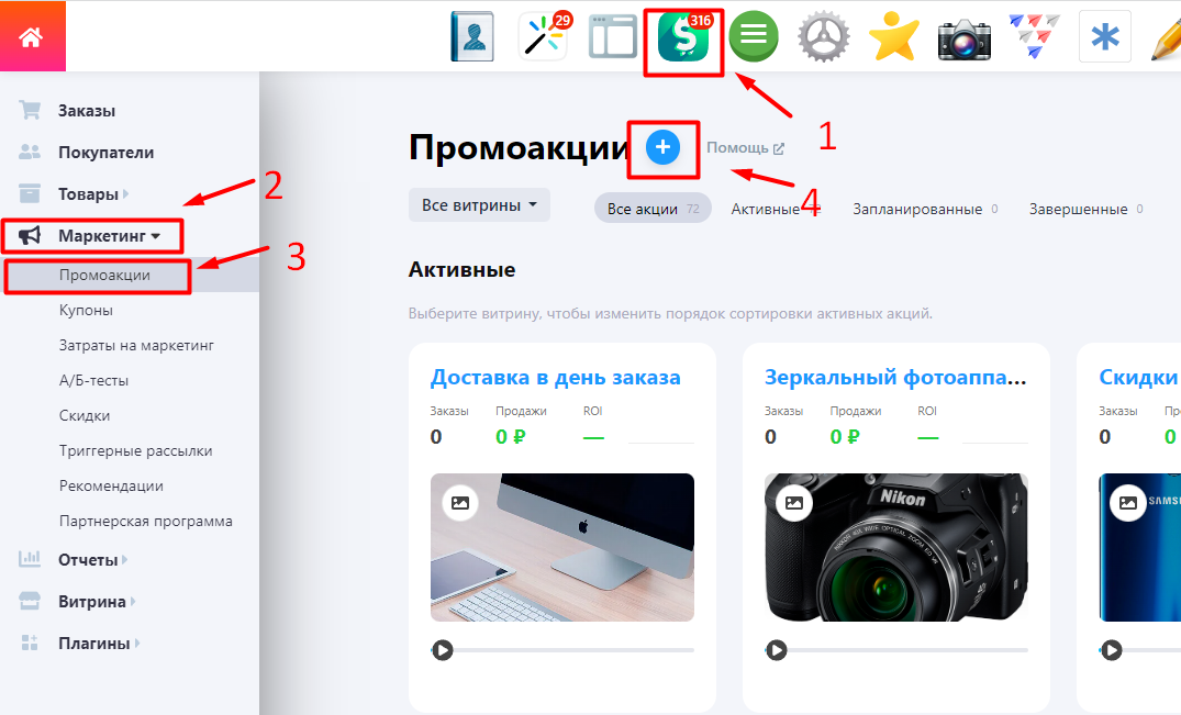 Промокарточки создаются в приложении Магазин - Маркетинг - Промокарточки: