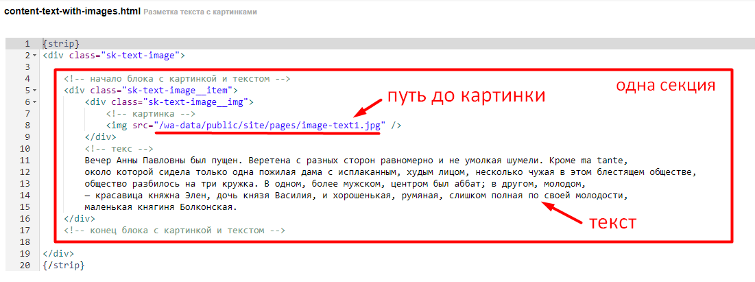 2) Шаблон содержит только одну секцию с текстом и картинкой, для добавления еще одной секции продублируйте выделенный код, который показан на скриншоте выше.