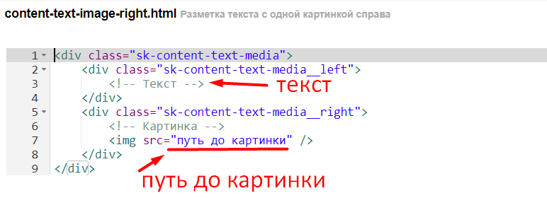 Для оформления таким образом контента скопируйте html-разметку из шаблона content-text-image-right.html. В коде вставьте свой текст и путь до картинки: